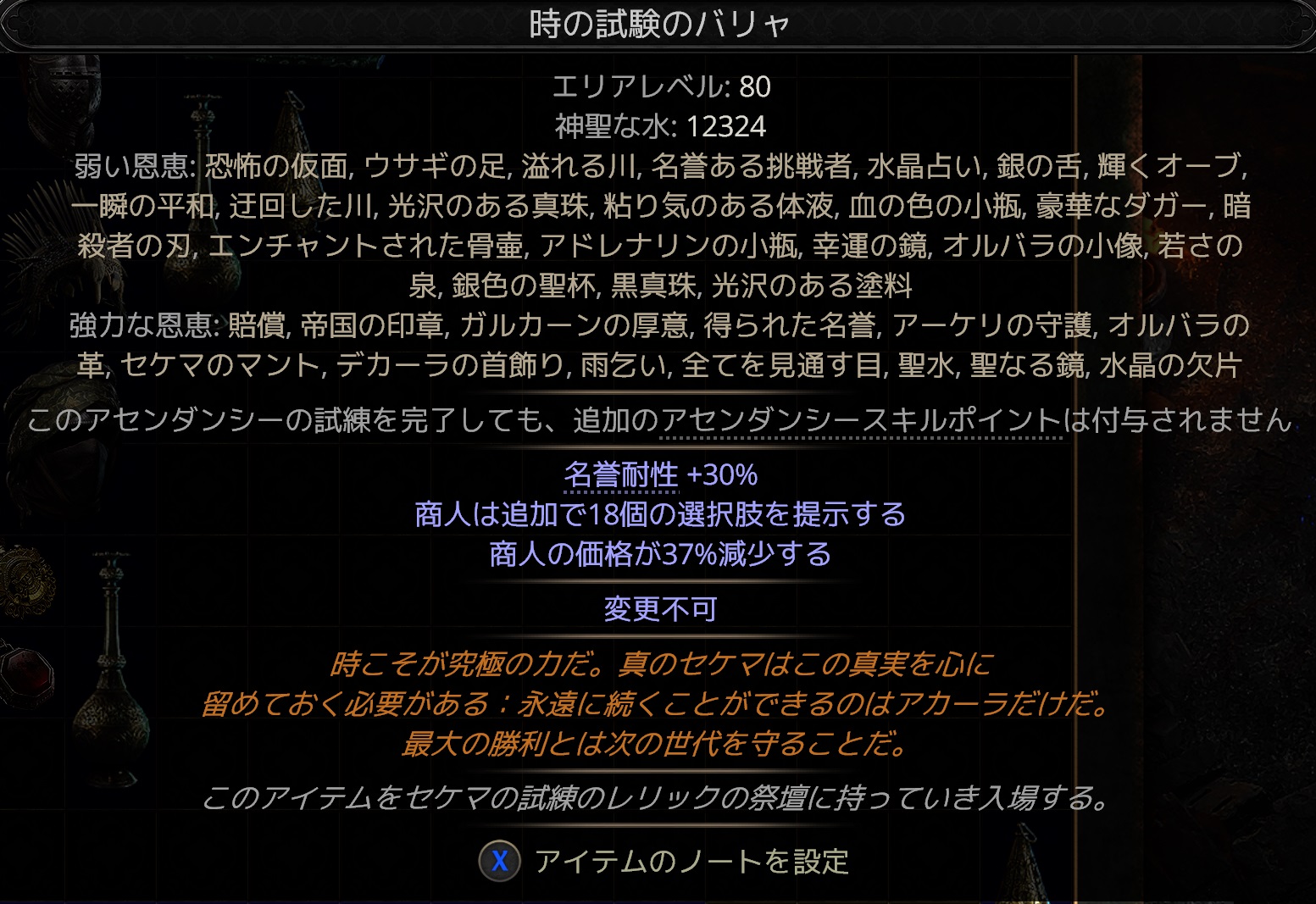 - アセンダンシーポイントの5pt目以降は一定以上の「セケマの試練」「混沌の試練」の攻略が必要。入場アイテムにアセンダンシーポイントの獲得が可能かどうかが記載されている