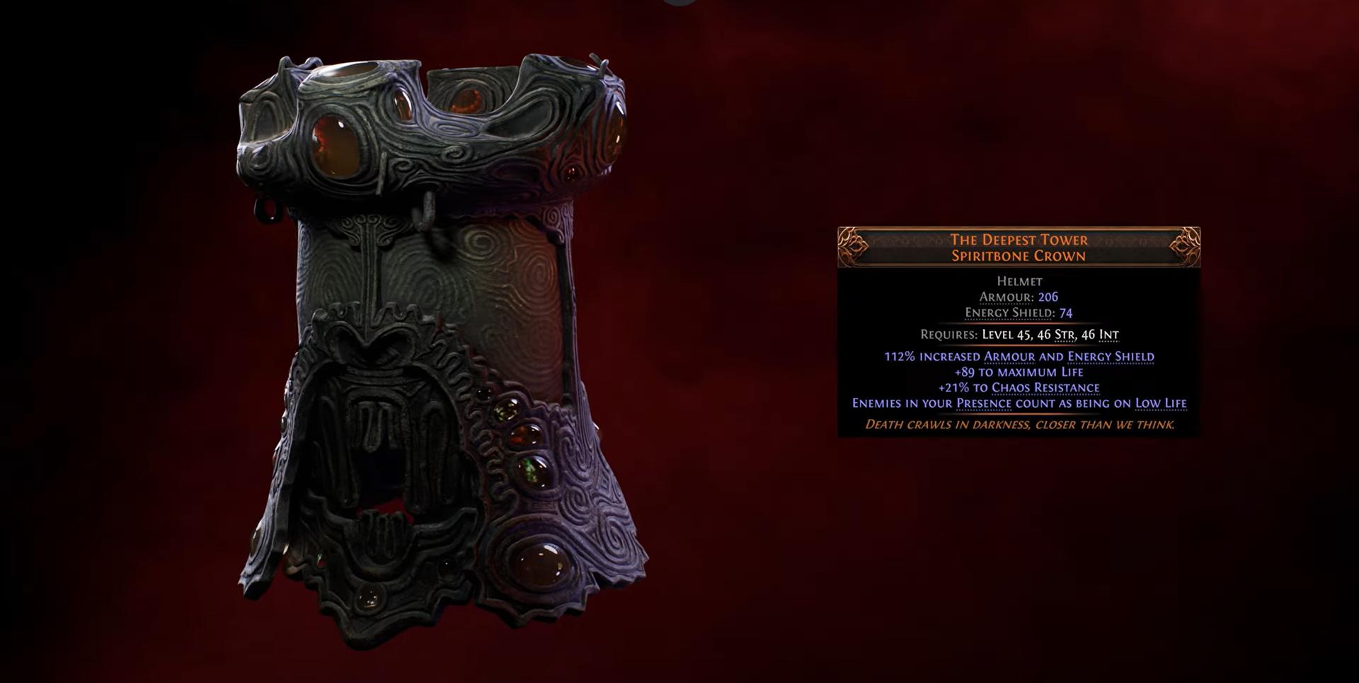 | Crystalline Phylactery | Can Socket one non-Unique Basic Jewel 100% increased Effect of Socketed Jewels 50% more Mana Cost if you have no Energy Shield | 一つのユニークでない通常のジュエルをソケットできる ソケットされたジュエルの効果が100%増加する エナジーシールドがない場合、マナコストが50%上昇する |